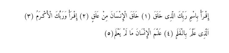 “Bacalah dengan (menyebut) nama Tuhanmu yang Menciptakan. Dia telah menciptakan manusia dari segumpal darah. Bacalah, dan Tuhanmulah yang Maha Pemurah, yang mengajar (manusia) dengan perantaraan qalam (pena). Dia mengajarkan kepada manusia apa yang tidak diketahuinya.”