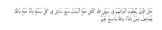 “Perumpamaan (nafkah uang dikeluarkan oleh) orang-orang yang menafkahkan hartanya di jalan Allah adalah serupa dengan sebutir benih yang menumbuhkan tujuh bulir, pada tiap-tiap bulir, seratus biji. Allah melipatgandakan (ganjaran) bagi siapa yang Dia kehendaki. Dan Allah Maha Luas (karunia-Nya) lagi Maha Mengetahui” (QS. al-Baqarah: 261).