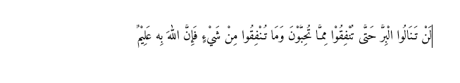 “Kamu sekali-kali tidak sampai pada kebaikan (yang sempurna), sebelum kamu menafkahkan sebagian harta yang kamu cintai. Dan apa saja yang kamu nafkahkan, maka sesungguhnya Allah mengetahuinya” (QS. Ali Imran: 92).