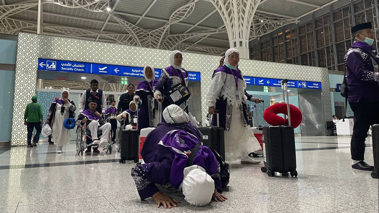 Setibanya di Madinah, beberapa jamaah terlihat mengekspresikan rasa syukur mereka dengan melakukan sujud syukur di Gate Hajj kedatangan Bandara AMAA Madinah.