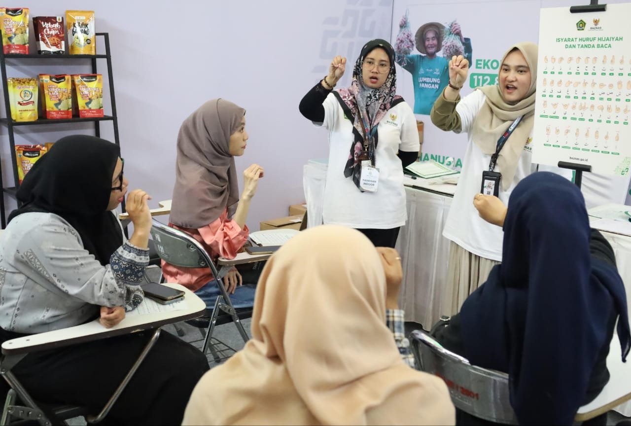 Booth kelas belajar bahasa isyarat dan al-Qur’an Braille ini merupakan kolaborasi antara BAZNAS dan Lajnah Pentashihan Mushaf al-Qur’an (LPMQ) Kementerian Agama (Kemenag) RI.