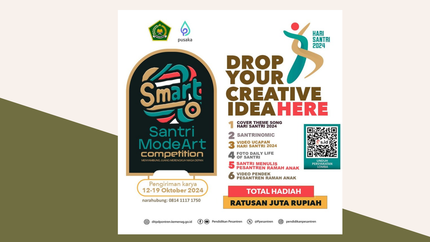 “Kami mengajak seluruh santri untuk dapat turut serta memeriahkan kompetisi ini. Jangan sampai ketinggalan, karena pendaftaran ditutup tanggal 19 Oktober 2024. Kemenag juga sudah menyiapkan hadiah total ratusan juta rupiah,” paparnya.