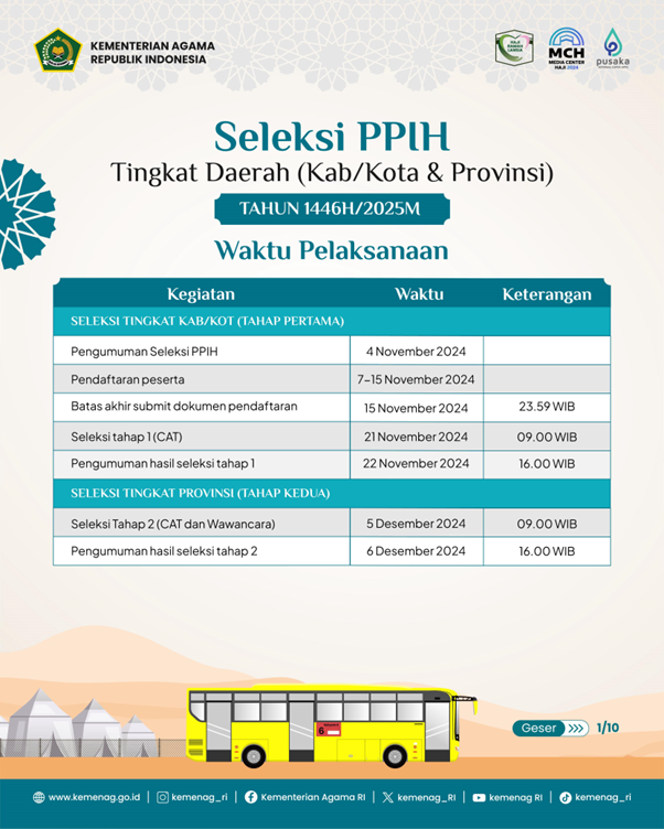 Arsad menjelaskan, ada dua tahapan pelaksanaan seleksi PPIH tingkat daerah. Seleksi pertama berlangsung pada tingkat kabupaten/kota melalui penilaian administrasi dan CAT. “CAT atau computer assisted test akan digelar pada 21 November 2024. Hasilnya diumumkan sehari berikutnya, 22 November 2024,” urai Arsad.